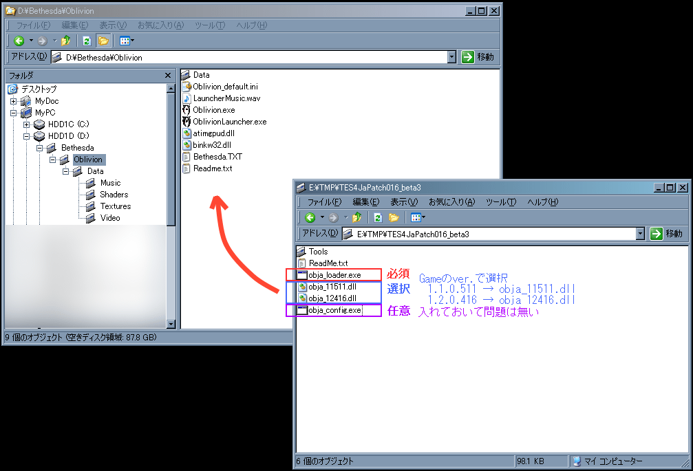 • obja_12416.dllobja_loader.exe を oblivion.exe と同じディレクトリにコピーします (file参考画像)